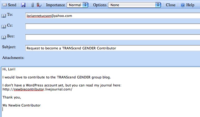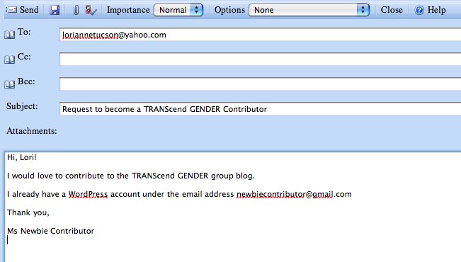 Send email to help (at) transcendgender (dot) com with a request to be added as a contributor – include a few details on what you have to offer the community. If you already have a WordPress account, include the email address associated with that account in the email, as in the second example below: