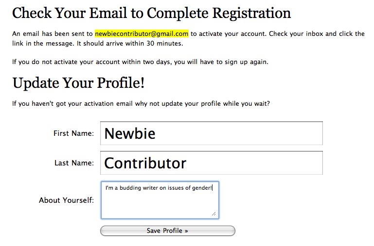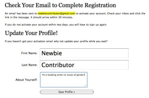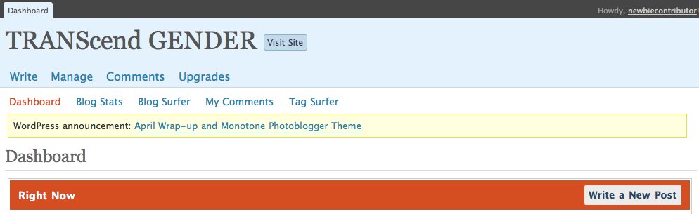 Thinking you’d like to become a TRANScend GENDER contributor, but a little nervous about the technical details? If you’ve never used WordPress before, or a collaborative blog, here’s a pictorial step-by-step guide on getting started. Follow along with Ms. Newbie Contributor as she signs up! (You can click on any of the screenshots below to see them full-size.)