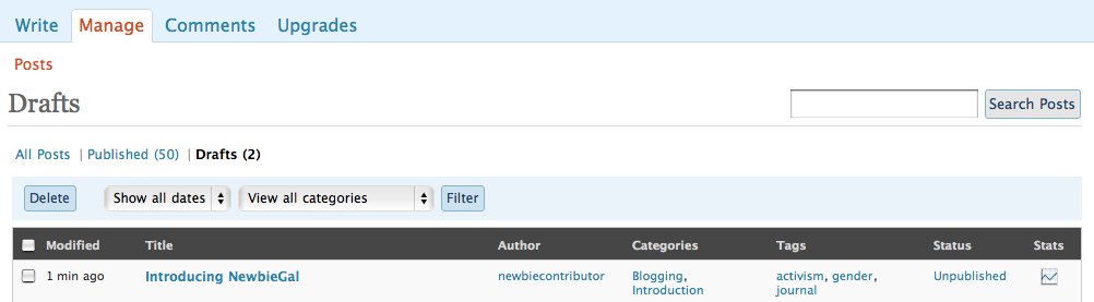 You don’t have to finish your post all in one sitting! WordPress will keep it in Draft mode until you’re satisfied with it. To go back and edit your post later, select ‘Manage’ and then ‘Drafts’ from the dashboard. You’ll see your post listed there, and you can select its title to return to the editing screen.